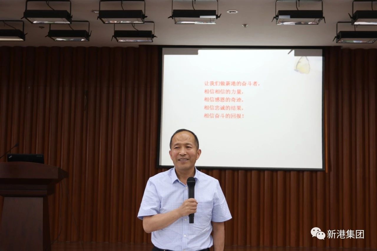 2019年5月18日,新港商学院第十一讲开课,集团研发部部长闵德秀做“心存感恩,奉献新港”主题演讲。集团董事长魏孝新、集团顾问颜进、副总经理龚杰、外贸总经理张曙光等高管出席,集团中层管理人员、后勤员工130余人参与培训。
