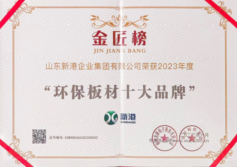 此次颁奖典礼,新港板材凭借优异的环保性能,荣获“2023金匠榜环保板材十大品牌”。