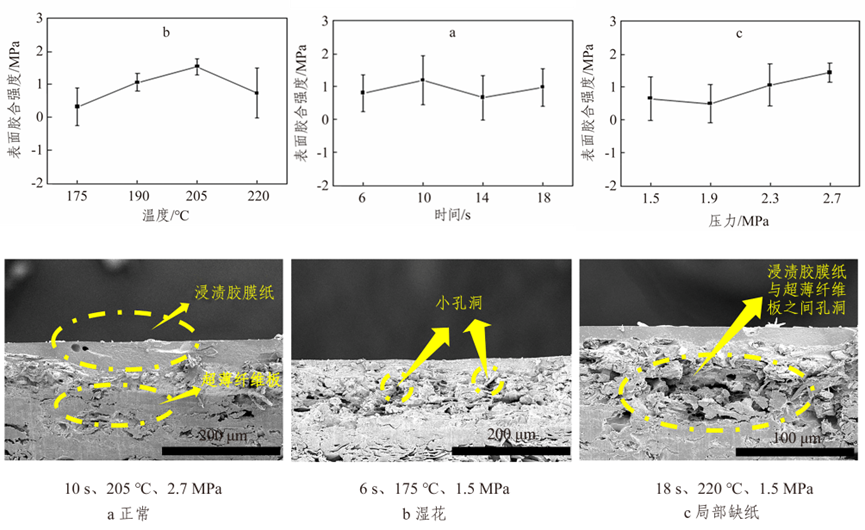 图:热压工艺对饰面板表面胶合强度影响的直观分析图以及断面微观形貌