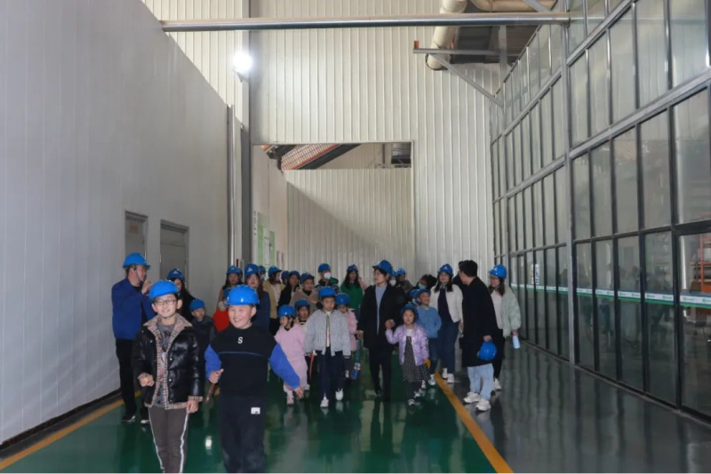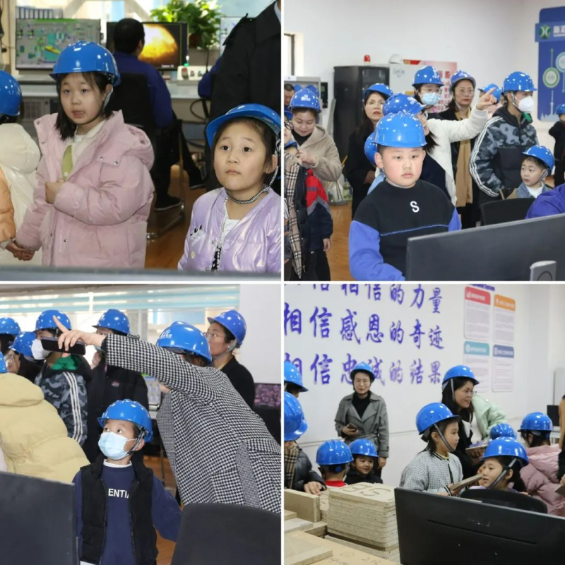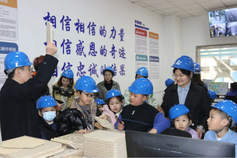 春意盎然万物新,上午九点,集团三十余名女职工及子女齐聚新港集团,小朋友们满怀新奇与兴奋,有序走进新港集团超强刨花板生产线参观。