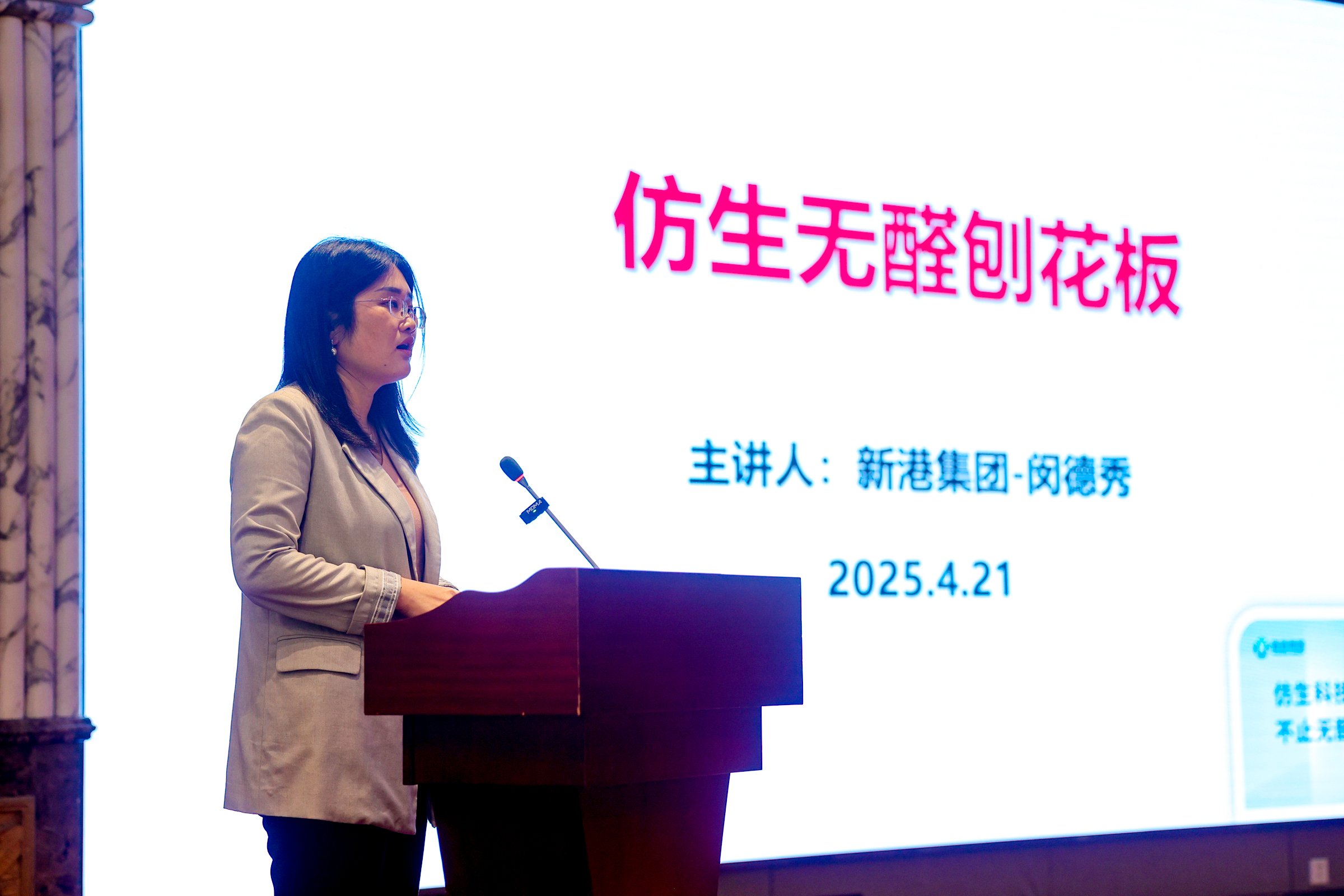 本次重量级行业会议上,新港集团研发总监闵德秀带领团队进行了仿生无醛刨花板和超高门用刨花板新产品创制基地专题汇报。