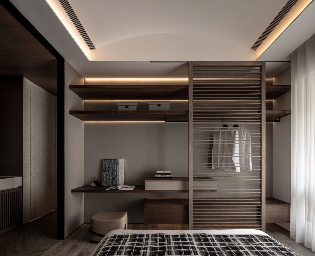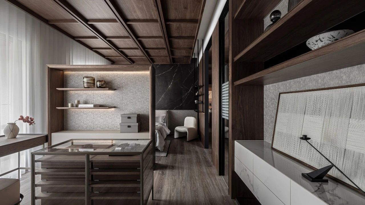 更衣室灵感汲取自精品酒店配置逻辑:独立饰品陈列区、精心规划的长衣悬挂区与叠衣展示区,搭配兼具梳妆与书写功能的工作台,共同构筑了一个集高效收纳与美学展示于一体的优雅场域。