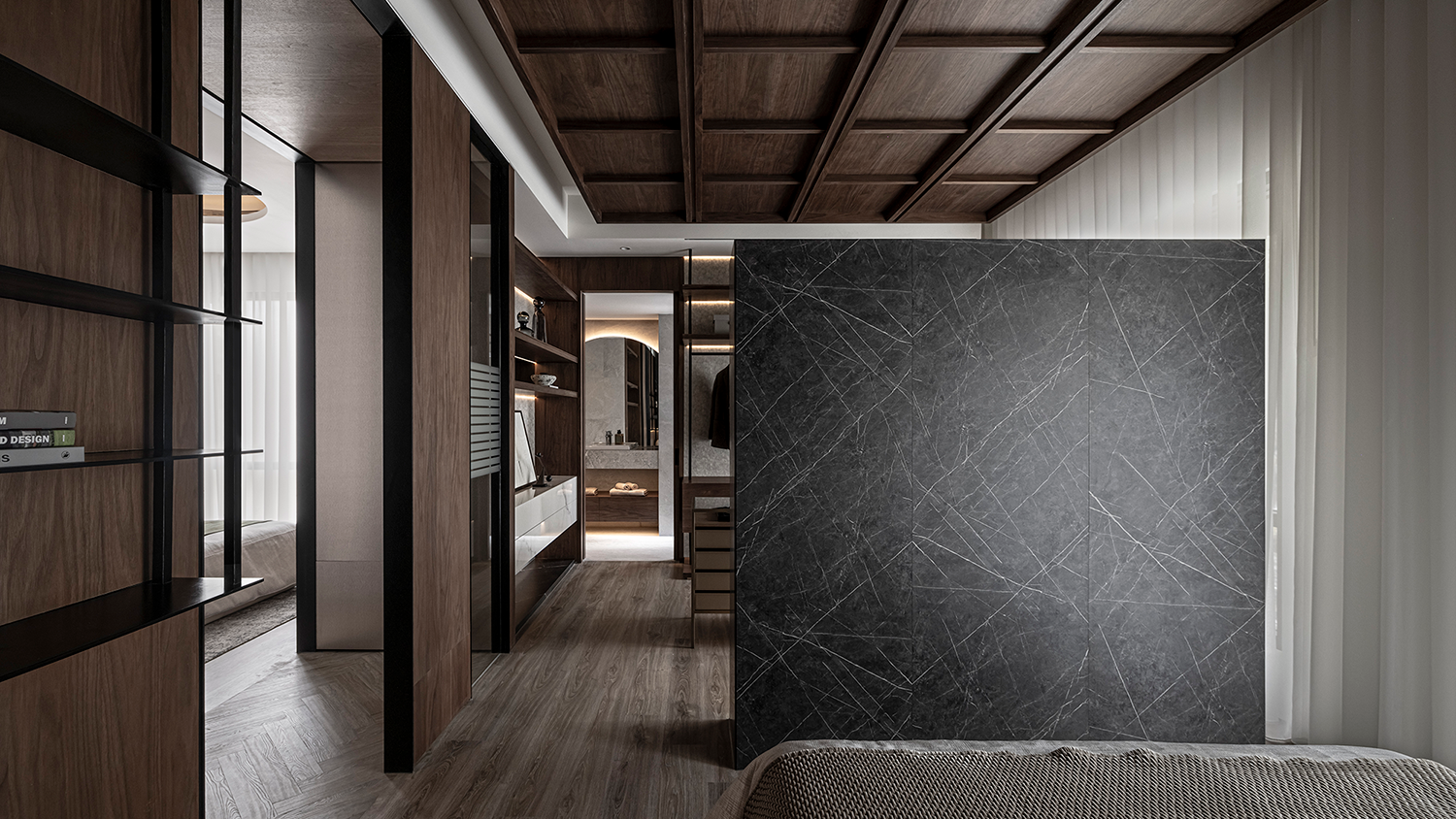 以开放式格局为基底,入口经过玄关,餐厅与客厅沿生活主轴线自然串联。透过地坪材质的分割,进行场域的划分与引导,其中客厅铺设木地板,搭配胡桃木色天花,强化空间的包覆感与深邃气息。
