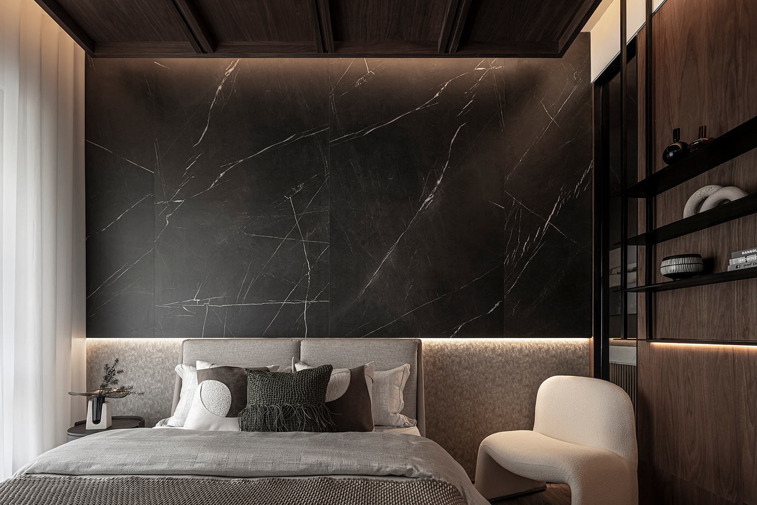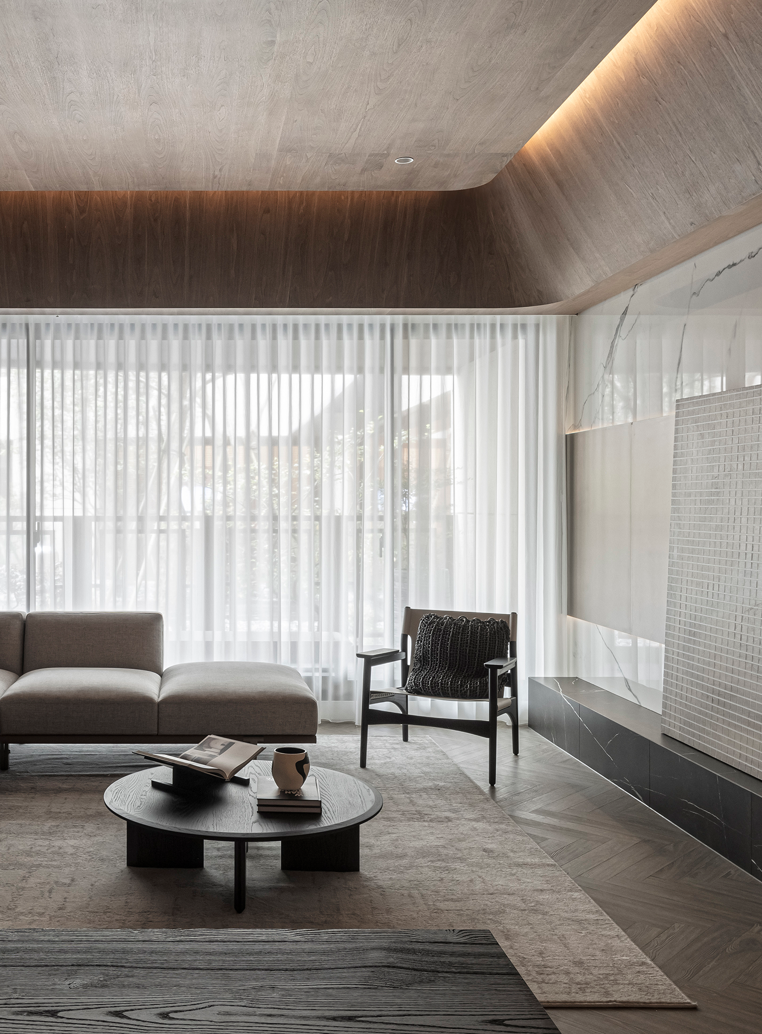 唐忠汉大师深谙此道,以石材的浑厚、木的温润、织品的细腻层层叠加,精妙平衡感官层次与实用功能,最终凝练成一处内敛与质感并存、经典与当代交融的生活范本。
