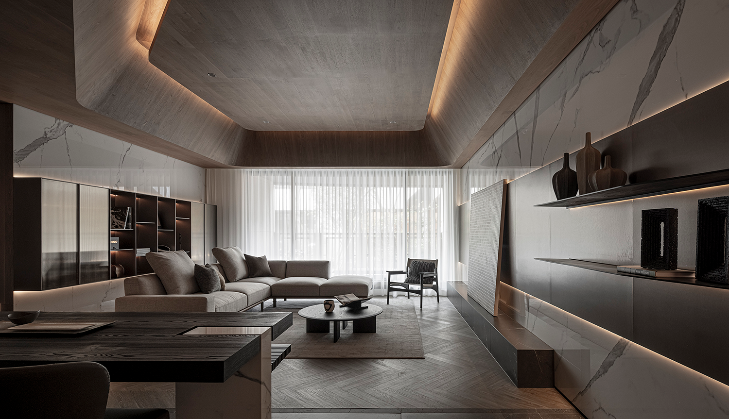 客厅底墙则运用大理石结合开放展示柜,柜门嵌入茶色长虹玻璃,独特的纹理和半透光特性,呈现更为轻盈的感受。中厨结合中岛与酒窖,整合生活机能的同时,延续金属板的材质语汇,提升整体的统一性与设计连贯性,以真实的材料打造视觉与触感的双重体验。