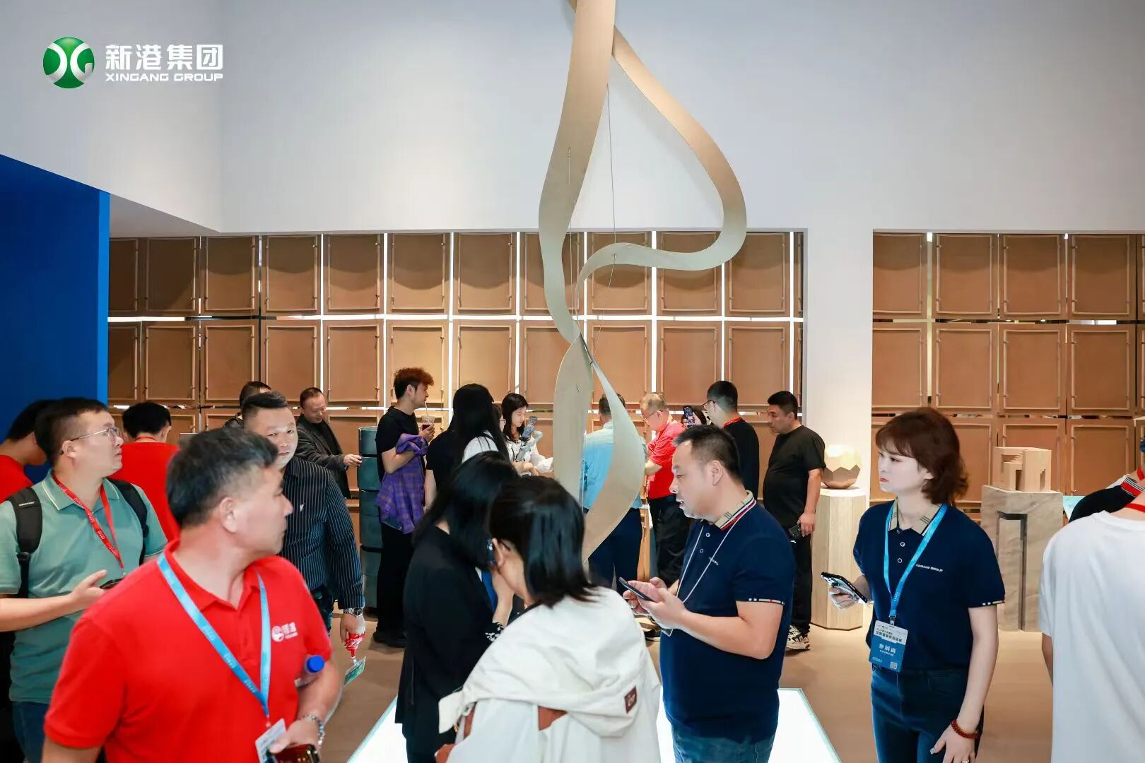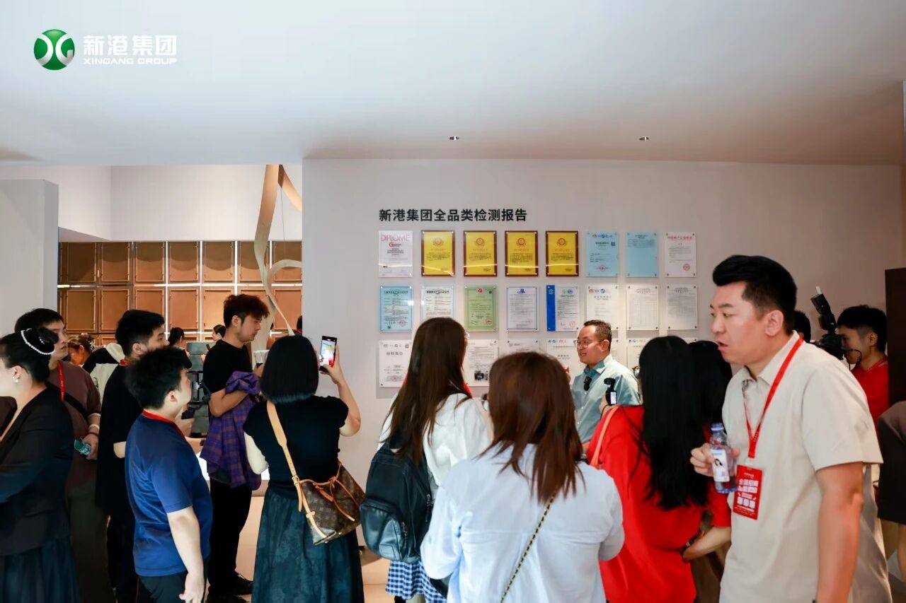 精彩体验的背后,离不开硬核产品的强力支撑——新港仿生精板在此次展会上依旧是当之无愧的“硬实力担当”,从感官到功能性应用,全方位展现其无限可能。作为“镇馆之宝”之一的新港仿生胶,以0醛、0苯、0有害物质添加的极致环保优势,成为展位焦点,吸引众多观展者拍照打卡。