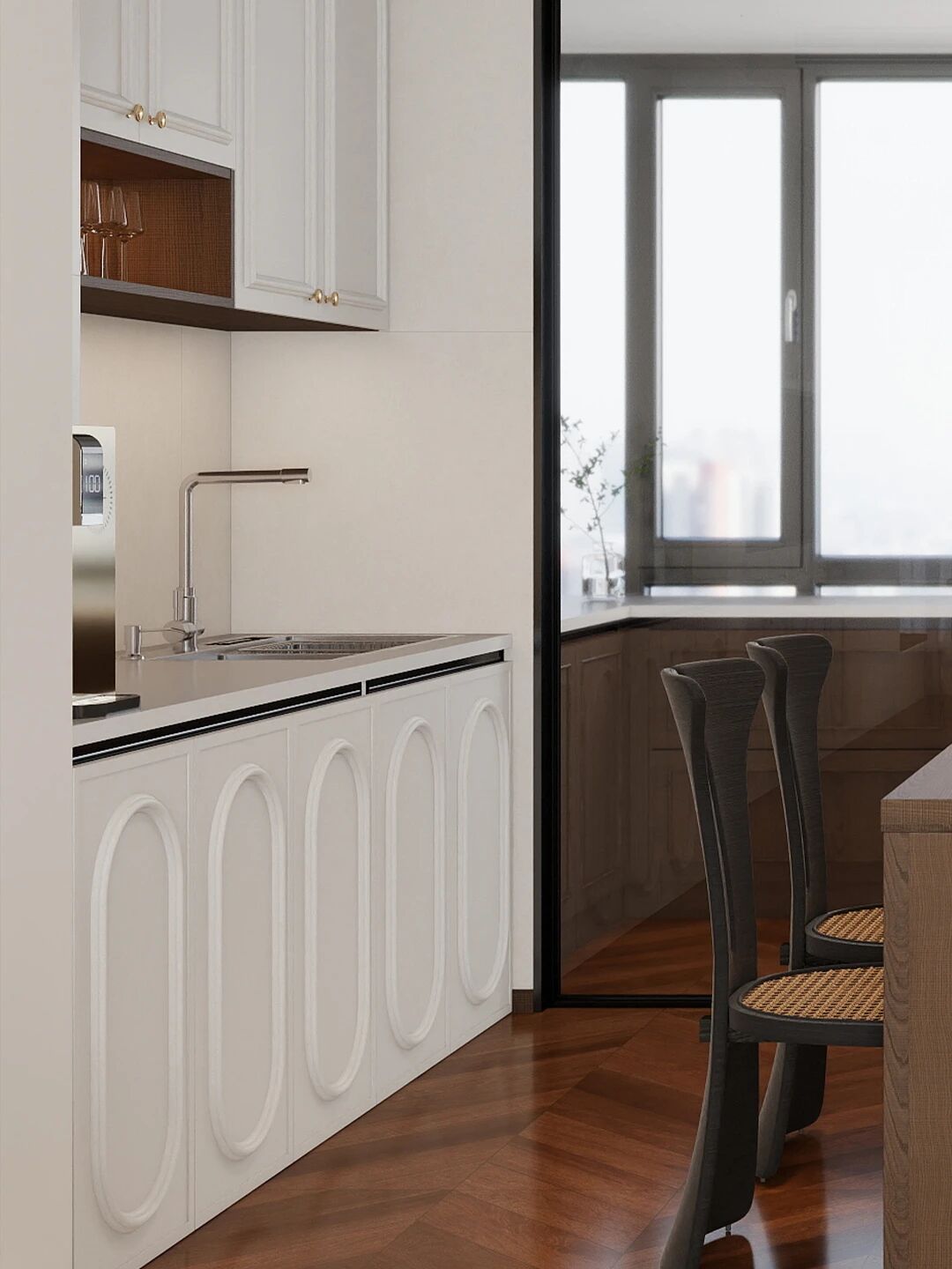 雅白在此场景中并非主角,它在餐边柜、橱柜、玄关柜的细节中静静营造空间的呼吸感。
