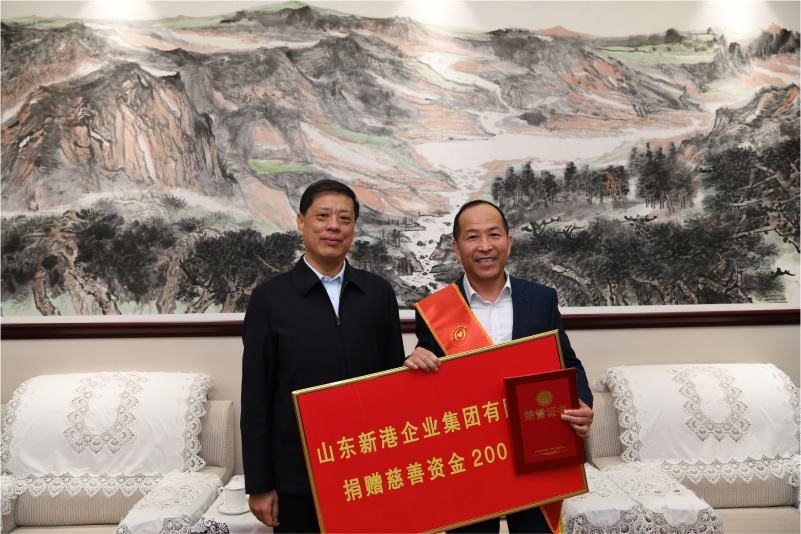 2021年1月,新港集团向市慈善总会捐赠200万元,时任市委书记王安德向新港集团颁发证书。