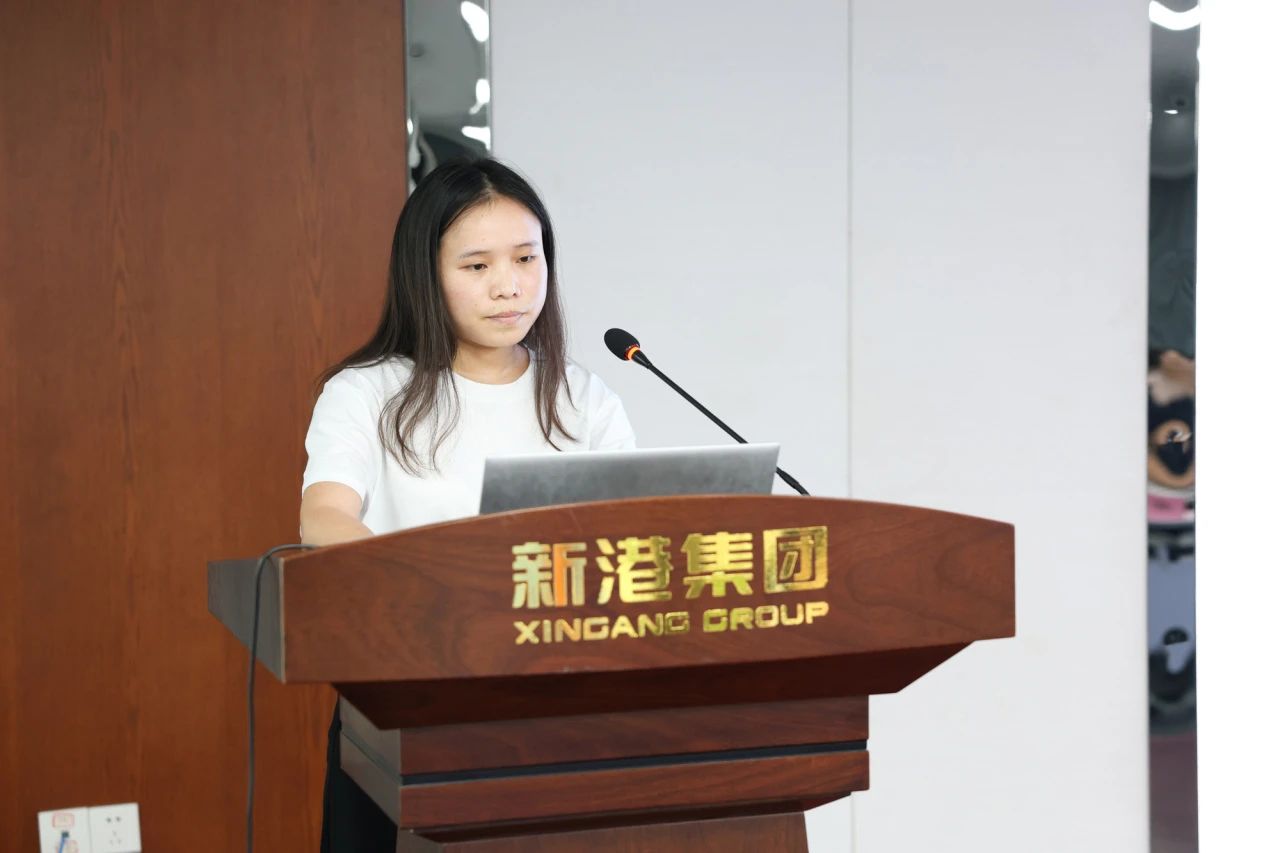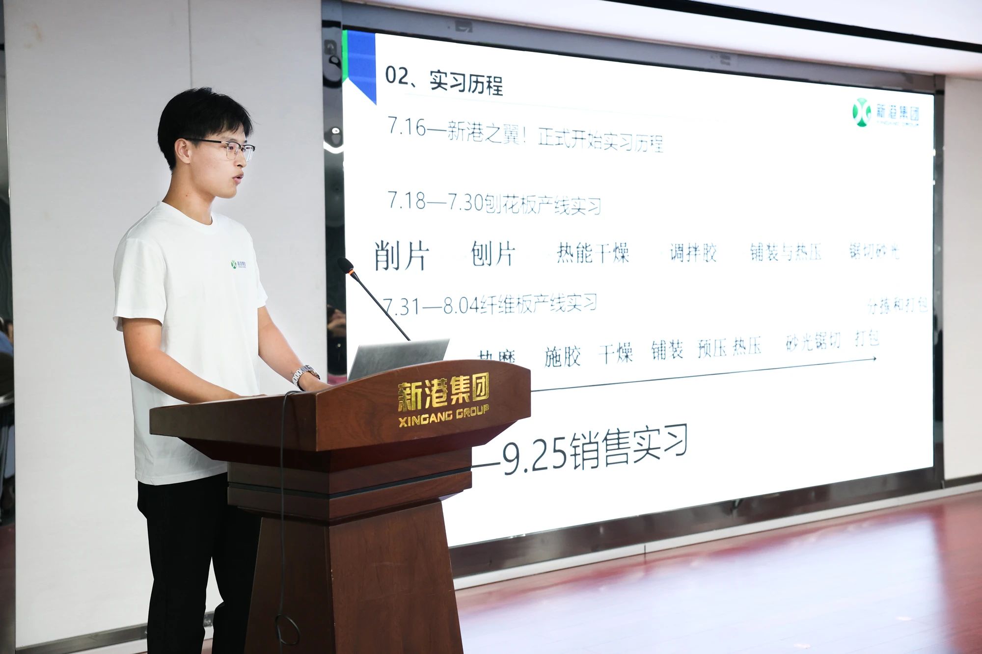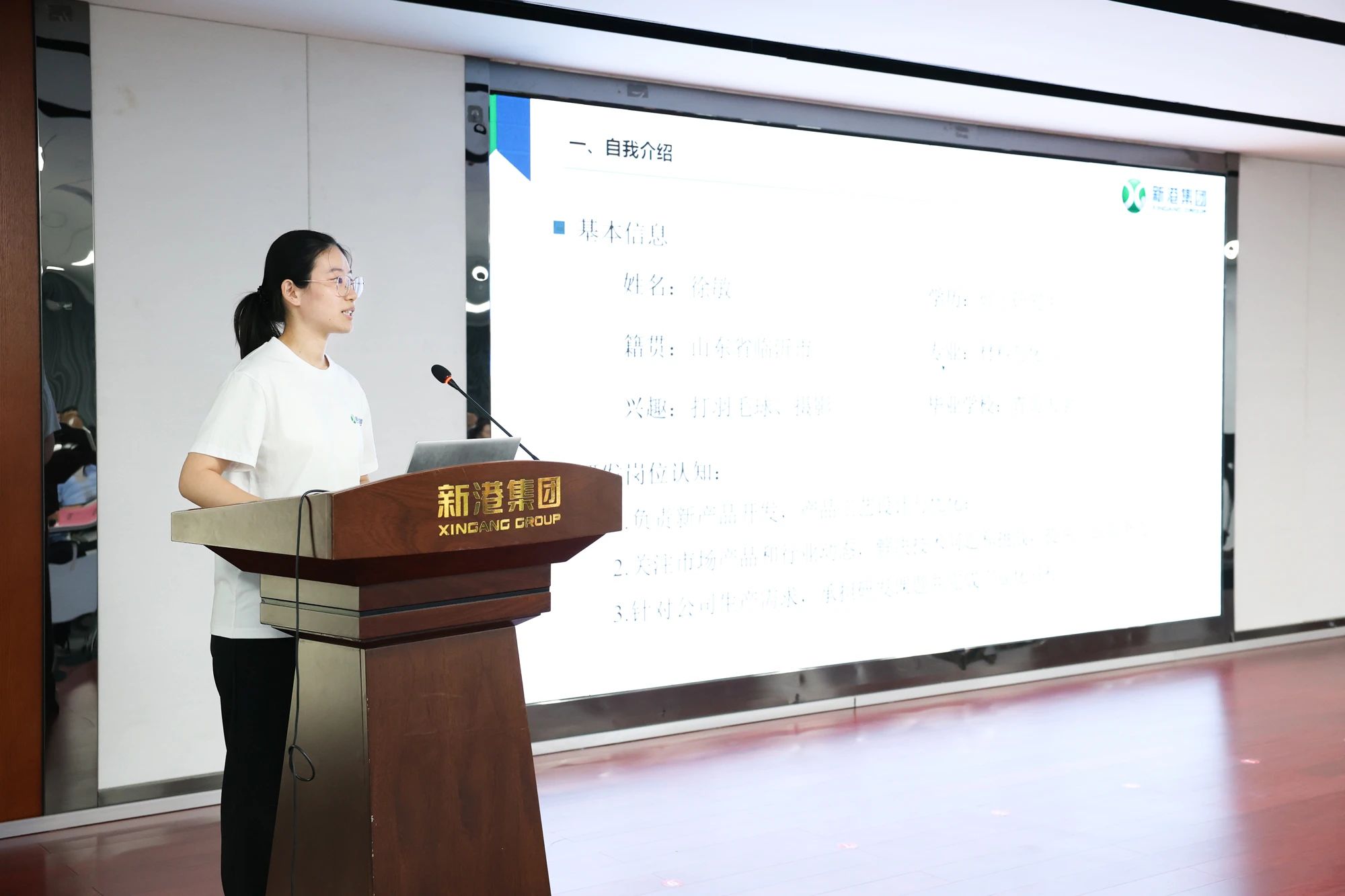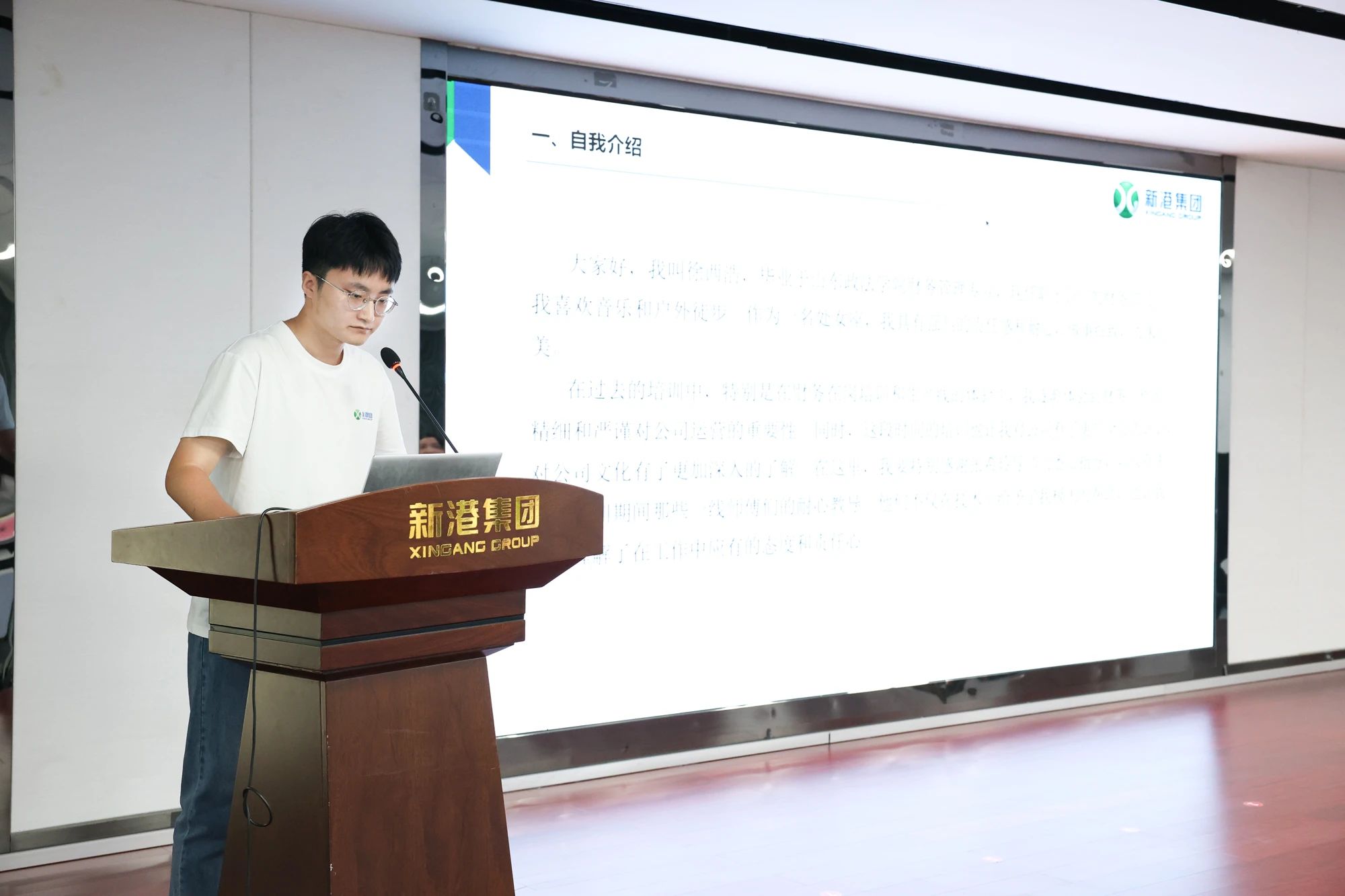 新港集团副总裁刘颖进行讲话,对2024届12位小翅膀圆满结业表示祝贺,同时对整个培训过程中大家所展现出的自信成长及师傅们的倾囊相授表示肯定与感谢,随后提出自己的感受与期望。她强调,小翅膀们要深入了解新港的文化,在工作中做到三个不要:不要撒谎,要做到诚实、实事求是;不要做老“好人”,要坚守底线,坚定原则主见;不要不去感恩。最后祝愿小翅膀们未来成为更好的自己,在新港的舞台上发光发热。新港集团副总裁姜婷婷结合自身实际经历,从“珍惜、任重道远、期望”三方面为小翅膀们讲述了职场中生动的一课。她鼓励小翅膀们要珍惜难得的平台机遇,并作出以下几点要求:第一要在工作中学习、进步,对得起岗位与工作;第二要坚持把学习作为自己终生的必修课,指出工作是学习,甚至是修行;第三要制定非常明确的学习计划。最后姜总寄语小翅膀们要努力拼搏,寻找标杆,在追赶标杆中成为标杆,向着从新港这艘大船上的一颗小零件到核心零件,再到成为独当一面的旗手不断迈进。新港集团研究院总监闵德秀进行讲话,对新入职学员提出了殷切期望。要珍惜公司给予的机会与平台,快速完成从新兵到老兵的转变,在工作过程中只争朝夕、敢为人先。要坚持三个相信:相信相信的力量,相信感恩的奇迹,相信忠诚的结果;不断践行三个超强:超强的学习力,超强的思考力,超强的执行力,让自己成为一名合格的新港铁军,通过自己的努力成为新港的故事。仪式进入尾声,新港集团董事长魏孝新作总结发言,高度赞扬了小翅膀们汇报环节中表现出的青春风采,引经据典带领新员工深入了解了新港三十一年来的发展历史及文化使命,勉励大家以东北林业大学李坚院士为榜样力量。他强调,新员工应与新港企业价值观保持一致,坚持以人为本、永不自满的理念,寻找标杆、学习标杆,站稳走实人生历程中新阶段的第一步;同时常怀感恩之心,珍惜当下,忠诚事业,协同作战,厚植文化底蕴,共筑百年新港。逐梦新港,淬炼成钢。新港集团始终重视人才队伍建设,未来将进一步实施人才强企战略,持续优化人才培养模式,吸引更多优秀人才加入新港的大家庭,同时为每一位员工提供广阔的发展空间和成长机会。“新港之翼”小翅膀们从这里启航,志存高远,脚踏实地,借助新港这个平台成长、提升、突破,在新的岗位上彰显使命与担当,让青春在逐梦的奋斗中升华,为实现新港“全球木业科技领军企业”的美好愿景贡献自己的力量。